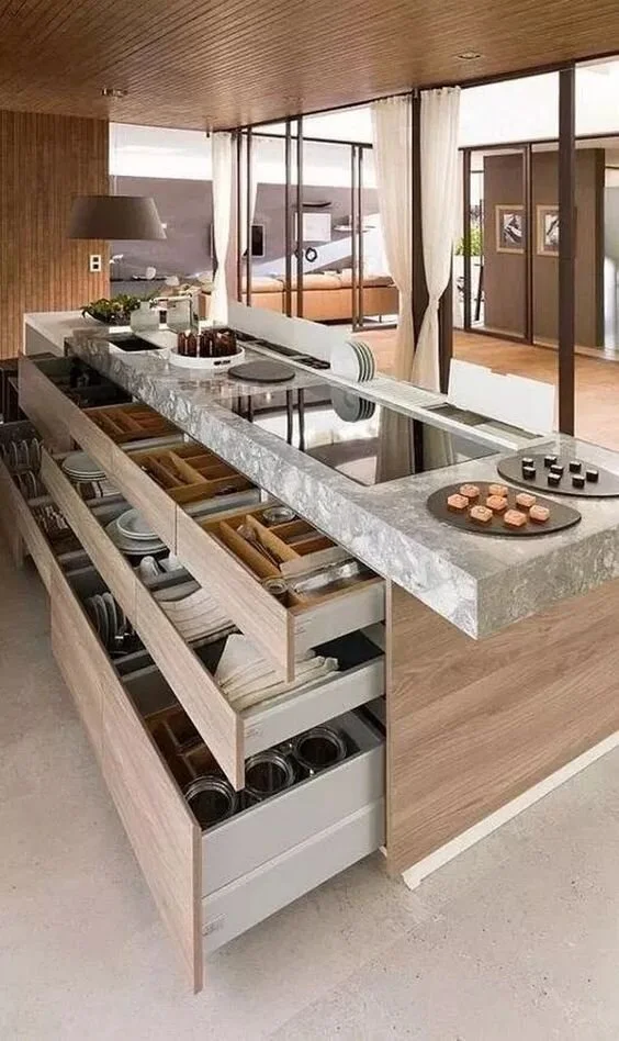 While drawers are nothing new in the kitchen, their functionality cannot be overstated. Like the benefits of larders over walk-in pantries, drawers provide more storage space per square foot than any shelving system can. Because drawers can be pulled out completely to reveal their contents, there’s no risk of losing track of that one can of soup for five years until you bring yourself to do a deep clean!