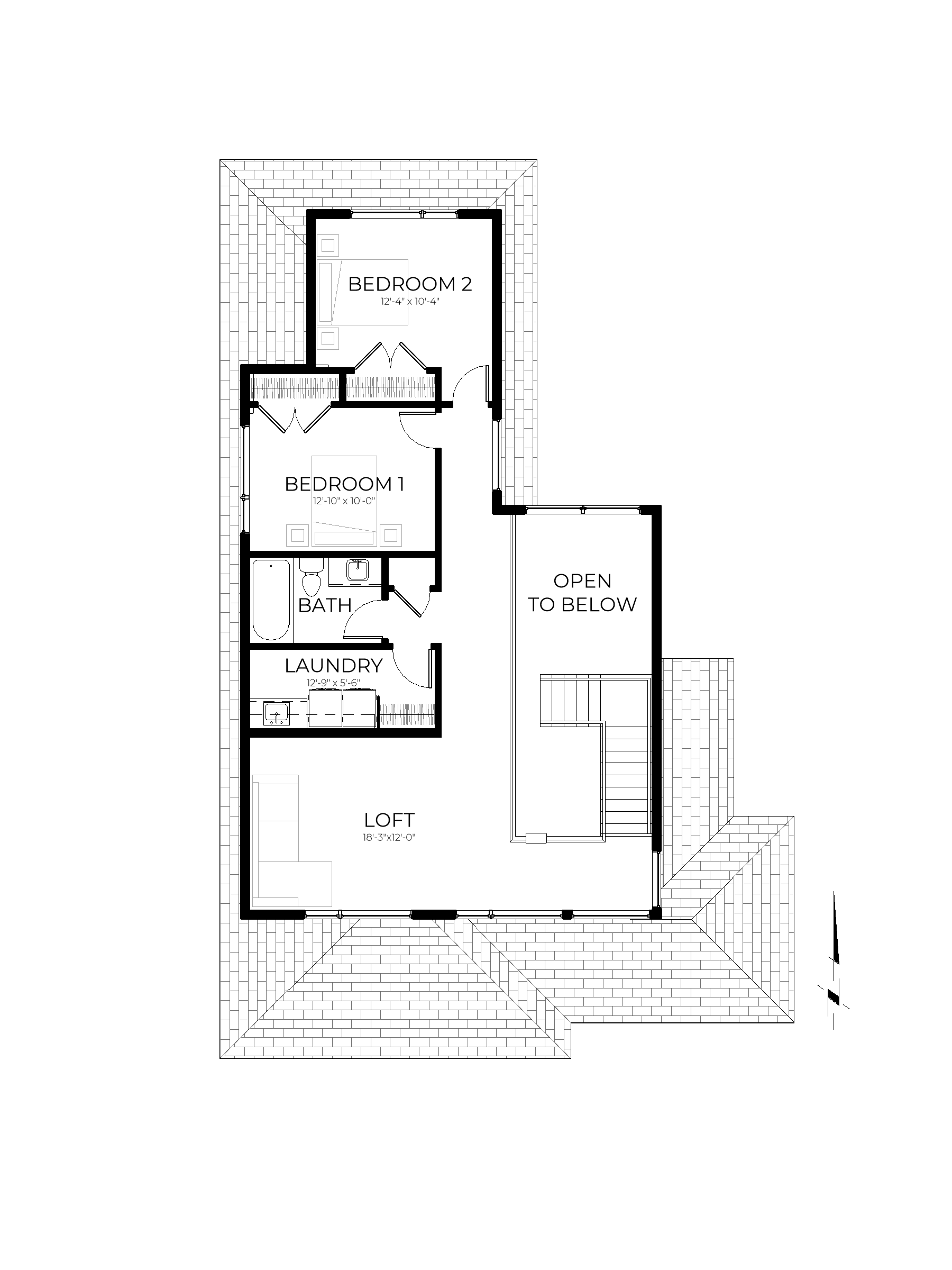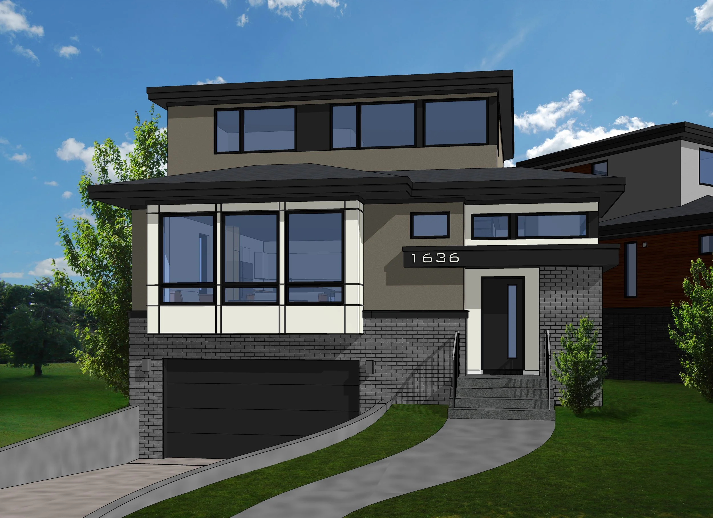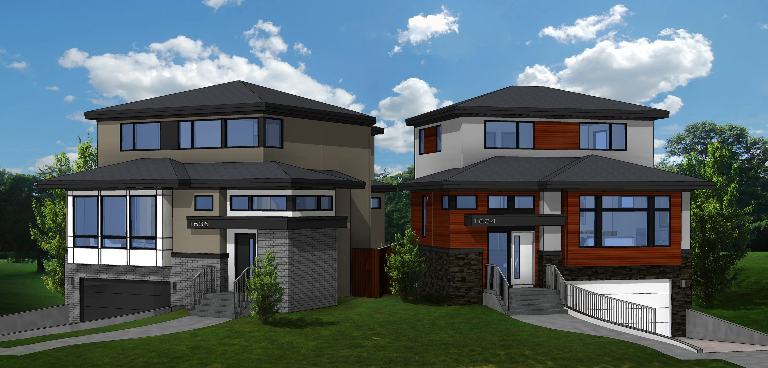 This reverse-pie shaped lot was too large for a single family home, but awkwardly narrow at the back to be subdivided, yet that’s what I managed to pull off. These two homes take full advantage of their wide frontage, with an attached double garage, wide front entry door, and expansive windows. However, as the lot tapers toward the back, these homes step down toward the master suite.